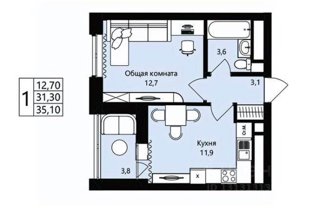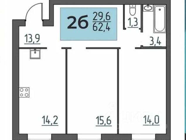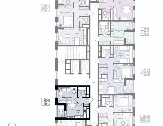 1 комнатные квартиры - от 39,6 кв. м. до 44,8 кв. м.2 комнатные квартиры - от 55,4 кв. м. до 62,4 кв. м.3 комнатные квартиры - 71,44 кв. м.