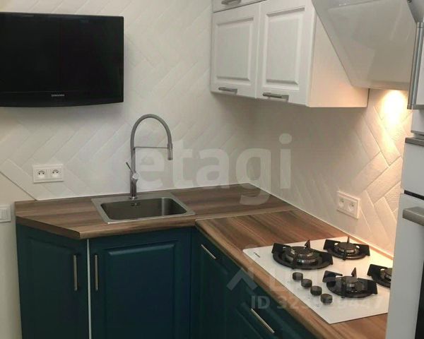 Кухня: 6 кв. м., дорогие обои, ламинат, а под кухней кафель, натяжной потолок с точечными светильниками, хорошая дверь, ПВХ окно с качественной фурнитурой, встроена вытяжка, у мойки и плиты выложен кафель, современная газовая плита. Шкаф купе в коридоре у кухни. Окно во двор, сторона света: запад.