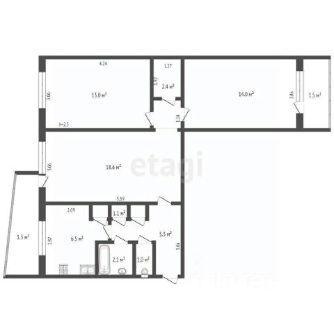 Площадь кухни 17,9 кв. м, зал 24,4, спальни — 18 и 13,6 кв. м. Каждая спальня имеет выход на лоджию.