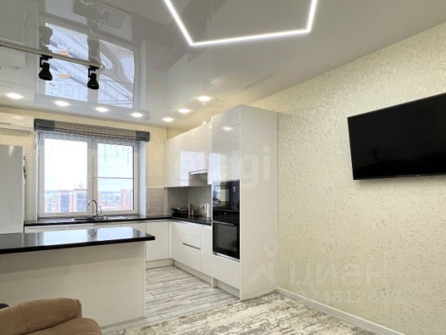 В квартире сделан современный качественный ремонт, пластиковые окна, натяжные потолки, на полу: на кухне 20 кв. м в рабочей зоне кафель + теплые полы, в зоне отдыха ламинат, во всех комнатах также везде положен ламинат, в прихожей кафель + система теплых полов.