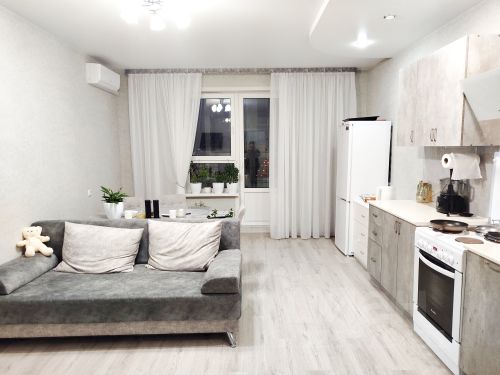 Особое внимание стоит уделить вместительной кладовой-гардеробной, скрытой за стильной "потайной" дверью-стеллажом, где достаточно места для хранения всех ваших вещей. Кухонная зона отделена элегантным керамогранитом, что придаёт пространству уникальный стиль.
