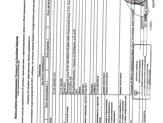 Данные получены с сайта ГИС Торги. Жилое помещение (квартира) общей площадью 36,9 кв.м., кад. 13:23:1001029:1218, находящееся в пределах объекта недвижимости с кад. 13:23:1001029:44, принадлежащее должнику Урайкиной Л.А. Зарегистрированные лица отсутствуют. Сведениями о фактическом состоянии объекта недвижимости, о задолженности по коммунальным платежам и взносам на капитальный ремонт организатор торгов не располагает. Техническая документация на объект недвижимости и его фотографии отсутствуют у организатора торгов