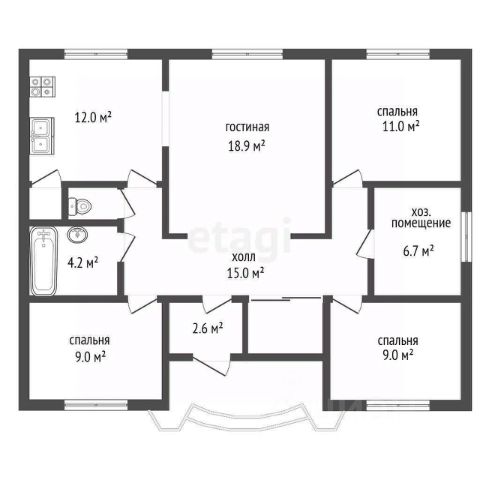 1 этаж: тамбур для обуви, гардеробная, холл, кухня, гостиная, спальня, санузел совмещенный.
