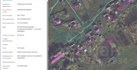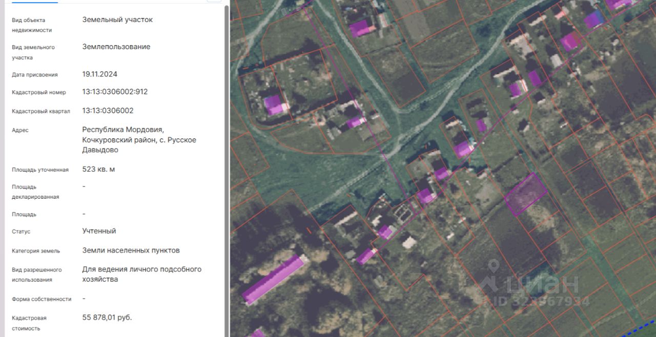 Земельный участок с видом разрешенного использования: для ведения личного подсобного хозяйства, площадью 523 (пятьсот двадцать три) кв.м., с кадастровым номером земельного участка: 13:13:0306002:912, расположенный по адресу: Республика Мордовия, Кочкуровский район, с. Русское Давыдово, категория земель: земли населенных пунктов