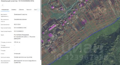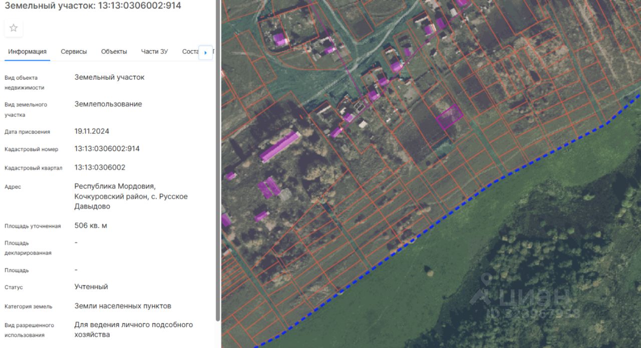 Земельный участок с видом разрешенного использования: для ведения личного подсобного хозяйства, площадью 506 (пятьсот шесть) кв.м., с кадастровым номером земельного участка: 13:13:0306002:914, расположенный по адресу: Республика Мордовия, Кочкуровский район, с. Русское Давыдово, категория земель: земли населенных пунктов
