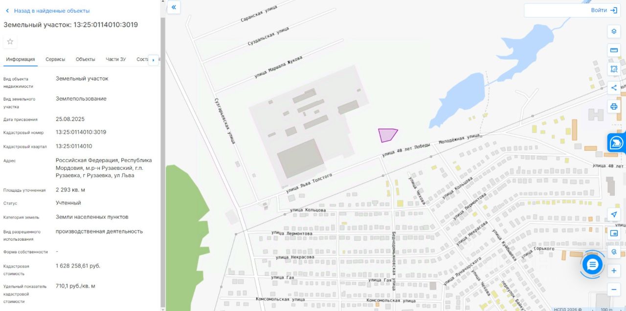 Земельный участок площадью 2293 кв.м с кадастровым номером 13:25:0114010:3019 расположен по адресу: Российская Федерация, Республика Мордовия, Рузаевский муниципальный район, городское поселение Рузаевка, г.Рузаевка, улица Льва Толстого. Вид разрешенного использования: производственная деятельность. Категория земель: земли населенных пунктов. Срок аренды - 3 года. П1 Производственна зона.