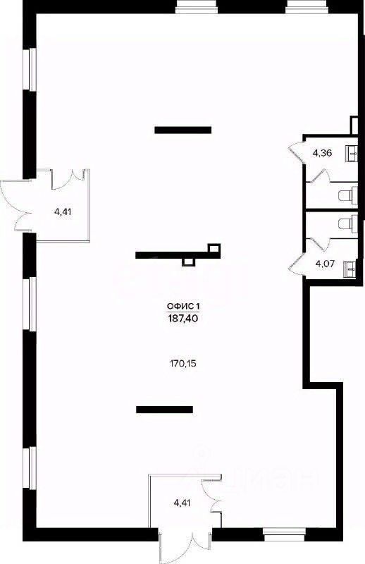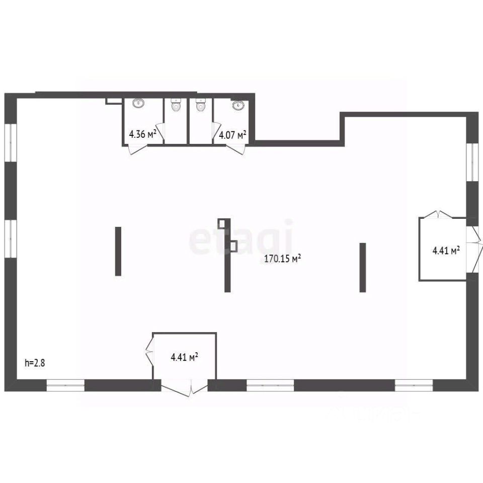 Помещение свободной планировки. Имеется 2 изолированных входа, с торца здания и с фасадной части. Отделка — предчистовая, выполнена стяжка пола, оштукатурены стены, заведены все коммуникации: электричество, отопление, водопровод, канализация. 2 раздельных санузла. Много света, т. к. в помещении 6 окон.