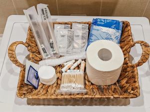 Есть всегда свежие полотенца, средства личной гигиены, одноразовые зубные щетки и пасты, шапочка для душа, фен, туалетная бумага, шампунь, мыло, стиральный порошок, средство для мытья посуды, губка для мытья посуды, кухонные полотенца.