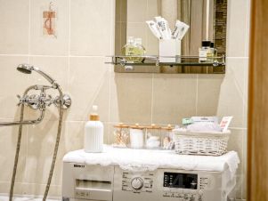 Есть всегда свежие полотенца, средства личной гигиены, одноразовые зубные щетки и пасты, шапочка для душа, фен, туалетная бумага, шампунь, мыло, стиральный порошок, средство для мытья посуды, губка для мытья посуды, кухонные полотенца.