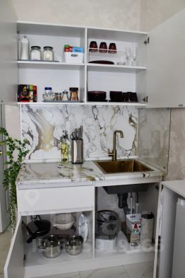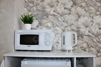 Полностью укомплектованная кухня: микроволновая печь, электрический чайник, фильтр для воды, холодильник, вся необходимая кухонная утварь и столовая посуда