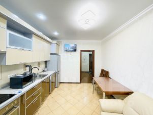 В квартире выполнен евроремонт. Просторная кухня оборудована всем необходимым: холодильник, плита, микроволновая печь и стиральная машина. В гостиной установлен телевизор и шкафы для хранения вещей. В комнате имеется двуспальная кровать и вместительный шкаф.