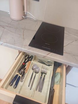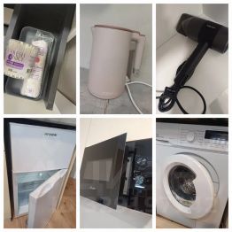 Электрический чайник, холодильник, индукционная плита, микроволновка, посуда, фен,стиральная машина, средства гигиены.