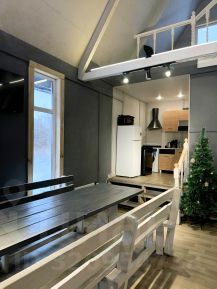 Площадь 155 м² — просторный, теплый, с автономным отоплением и горячей водой. 6+6 спальных мест — 2 комнаты с двуспальными кроватями и раскладными диванами (общая вместительность 12 человек). 2 санузла, полностью оборудованная кухня-гостиная. Большой стол на 40 человек + ТВ-зона — идеально для семейных праздников и отдыха компаний.