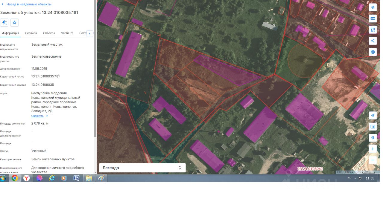 Земельный участок с кадастровым номером 13:24:0108035:181 площадь 2078 по адресу Российская Федерация, Республика Мордовия, муниципальный район Ковылкинский, городское поселение Ковылкино, город Ковылкино, улица Западная, земельный участок 2 Д