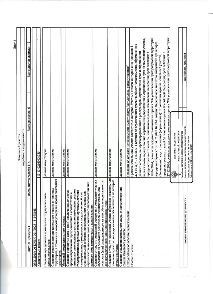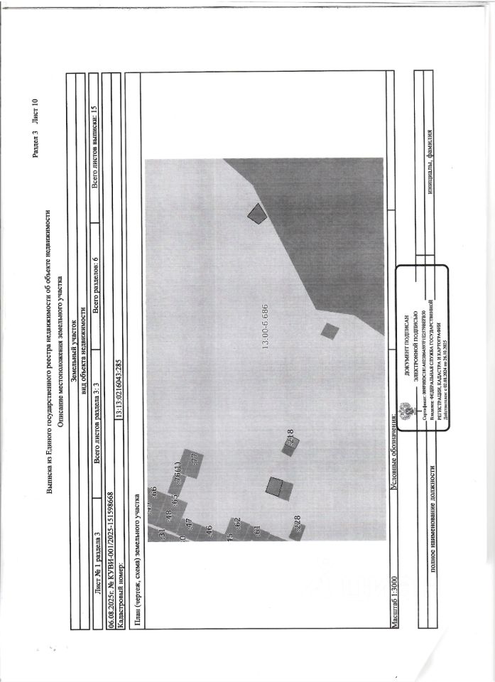 Земельный участок площадью 835+/-10 кв.м., кад. 13:13:0216043:285, категория земель: земли сельскохозяйственного назначения, виды разрешённого использования: для коллективного садоводства. Земельный участок принадлежит должнику Рыбину В.С. Сведениями о фактическом состоянии объекта недвижимости, о задолженности по коммунальным платежам и взносам на капитальный ремонт организатор торгов не располагает. Техническая документация на объект недвижимости и его фотографии отсутствуют у организатора торгов.