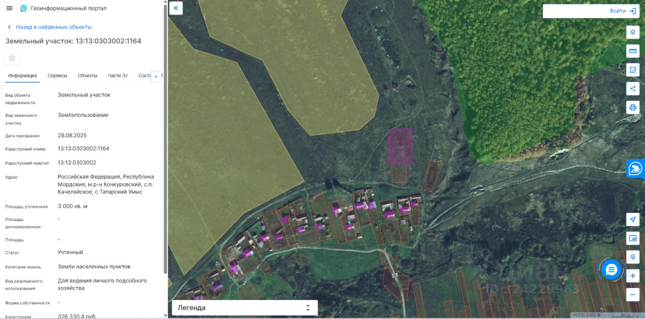Земельный участок с видом разрешенного использования: для ведения личного подсобного хозяйства, площадью 3000 (три тысячи) кв. м., с кадастровым номером земельного участка: 13:13:0303002:1164, расположенный по адресу (местоположение): Российская Федерация, Республика Мордовия, Кочкуровский р-н, с.п. Качелайское, с Татарский Умыс, категория земель: земли населенных пунктов.