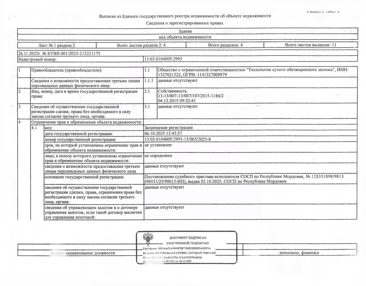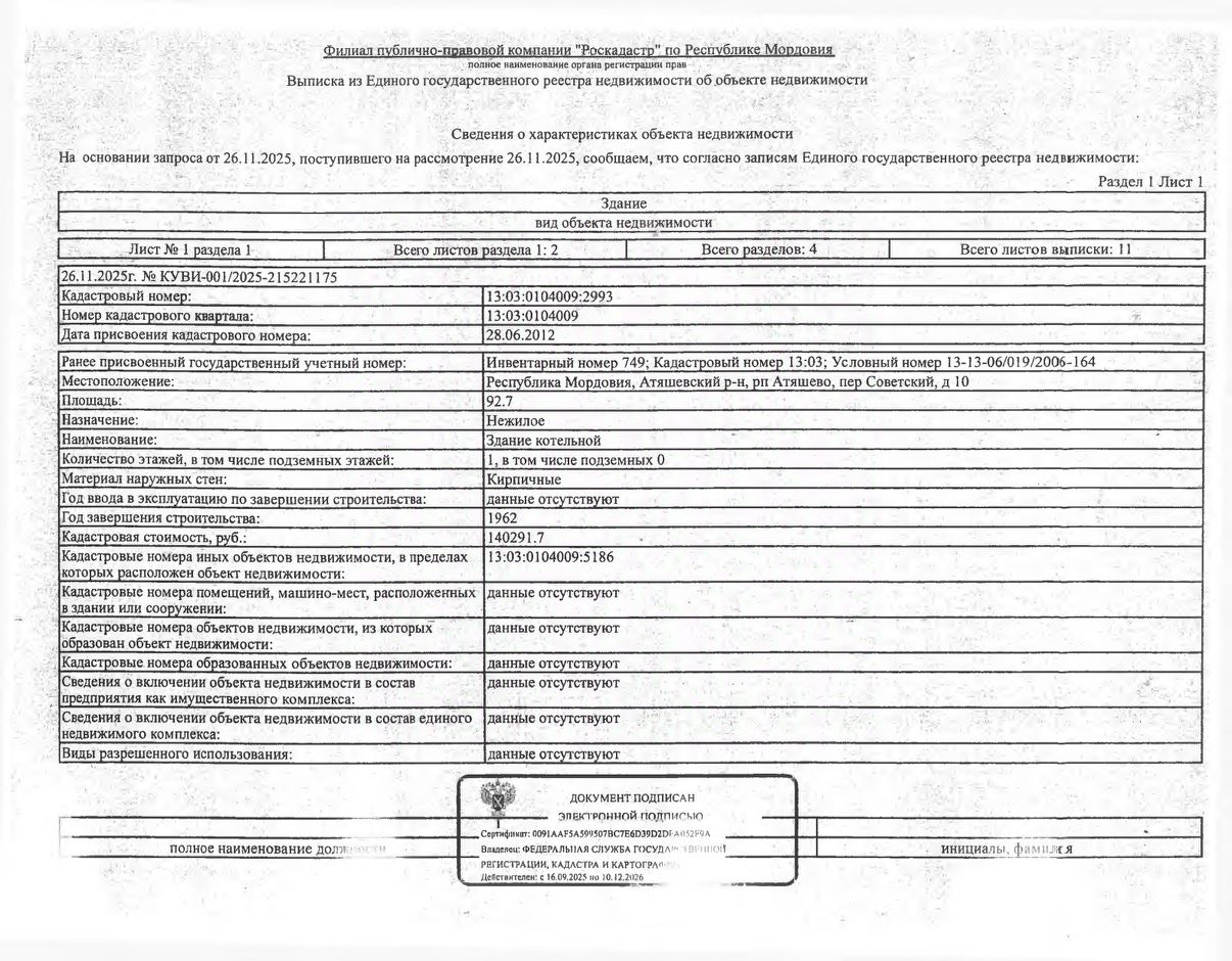 Нежилое здание (здание котельной) общей площадью 92,7 кв.м., кад. 13:03:0104009:2993, и земельный участок площадью 602+/-9 кв.м., кад. 13:03:0104009:5186, категория земель: земли населённых пунктов, вилы разрешённого использования: для размещения производственных и административных зданий, строений, сооружения промышленности и т.д. Объекты недвижимости принадлежат должнику ООО "Технологии сухого обезжиренного молока", ИНН 1327021522. Сведениями о фактическом состоянии объектов недвижимости организатор, о задолженности по обязательным платежам торгов не располагает. Техническая документация на объекты недвижимости и его фотографии отсутствуют у организатора торгов.