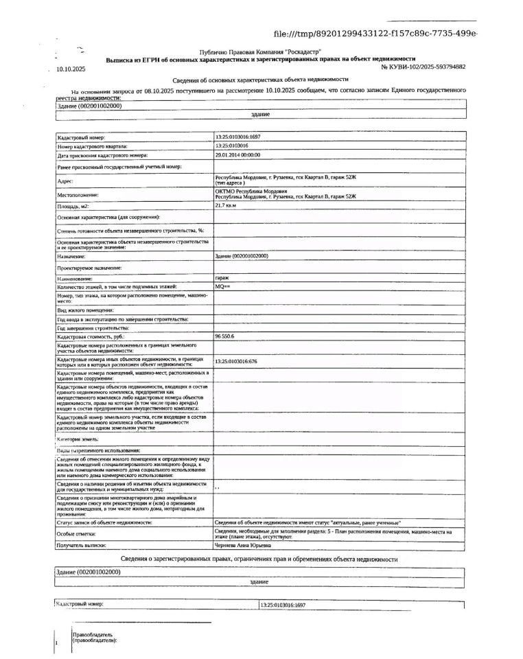 Нежилое здание (гараж) общей площадью 21,7 кв.м., кад. 13:25:0103016:1697, находящийся в пределах объекта недвижимости с кад. 13:25:0103016:676, принадлежащий должнику Антонову П.А. Земельный участок, находящийся под зданием, является муниципальной собственностью и находится в пользовании у должника на основании Договора аренды 3-12 от 12.01.2012г., заключенного сроком на 20 лет. Сведениями о фактическом состоянии объекта недвижимости организатор, о задолженности по обязательным платежам торгов не располагает. Техническая документация на объект недвижимости и его фотографии отсутствуют у организатора торгов.