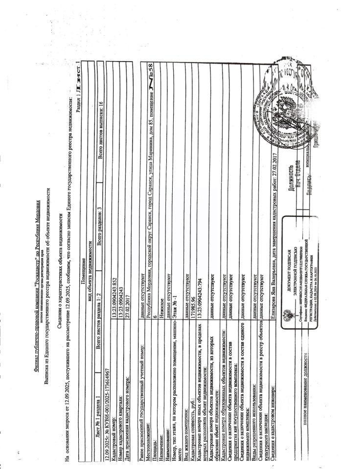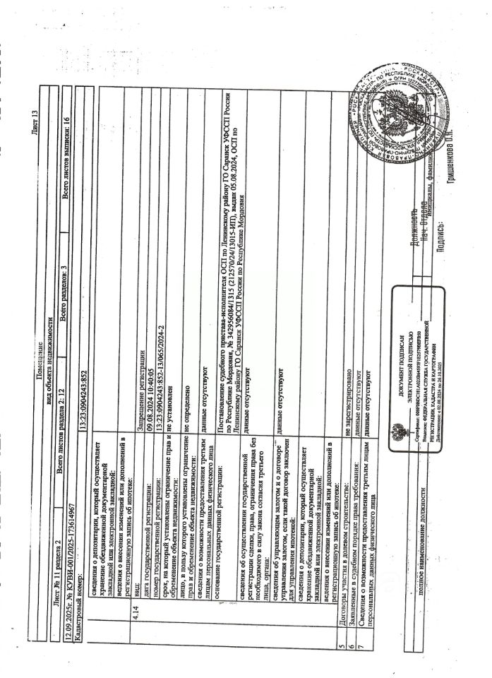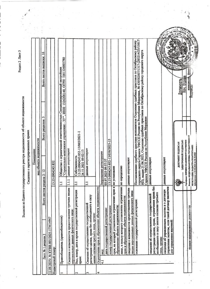 Нежилое помещение общей площадью 6 кв.м., кад. 13:23:0904243:852, этаж -1, находящееся в пределах объекта недвижимости с кад. 13:23:0904243:794, принадлежит должнику ООО Специализированный застройщик "Строительно-монтажное управление-33", ИНН 1326208140. Сведениями о фактическом состоянии объекта недвижимости, о задолженности по коммунальным платежам и взносам на капитальный ремонт организатор торгов не располагает. Техническая документация на объект недвижимости и его фотографии отсутствуют у организатора торгов.