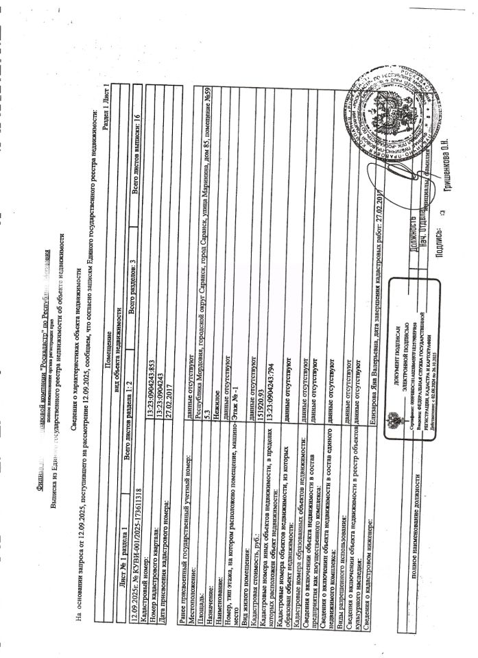 Нежилое помещение общей площадью 5,3 кв.м, кад. 13:23:0904243:853, этаж -1, находящееся в пределах объекта недвижимости с кад. 13:23:0904243:794, принадлежит должнику ООО Специализированный застройщик "Строительно-монтажное управление-33", ИНН 1326208140. Сведениями о фактическом состоянии объекта недвижимости, о задолженности по коммунальным платежам и взносам на капитальный ремонт организатор торгов не располагает. Техническая документация на объект недвижимости и его фотографии отсутствуют у организатора торгов.
