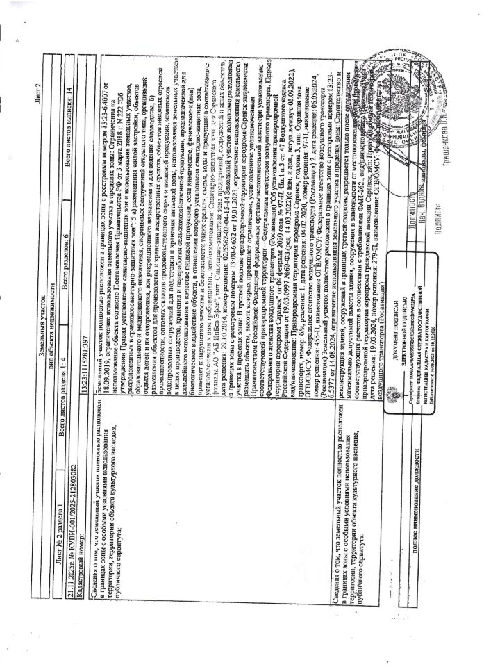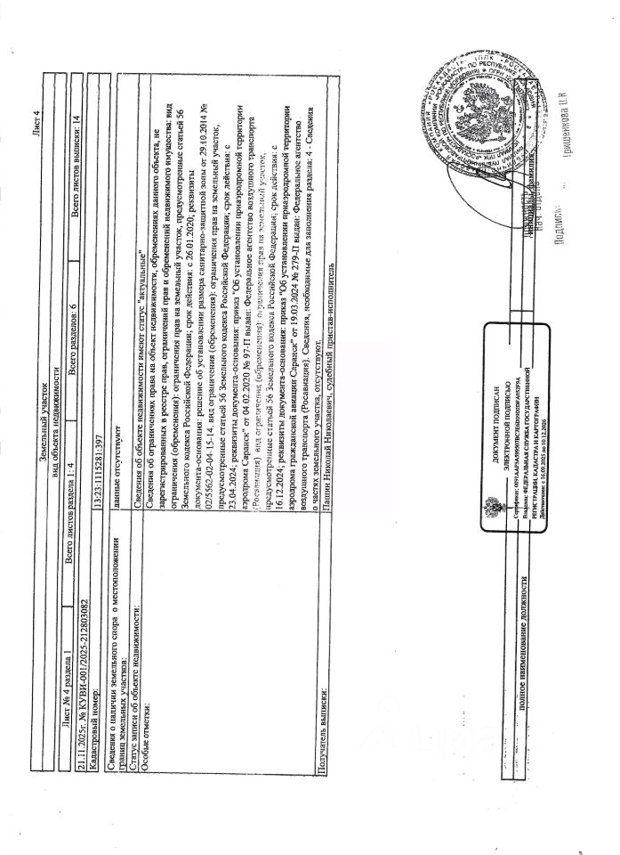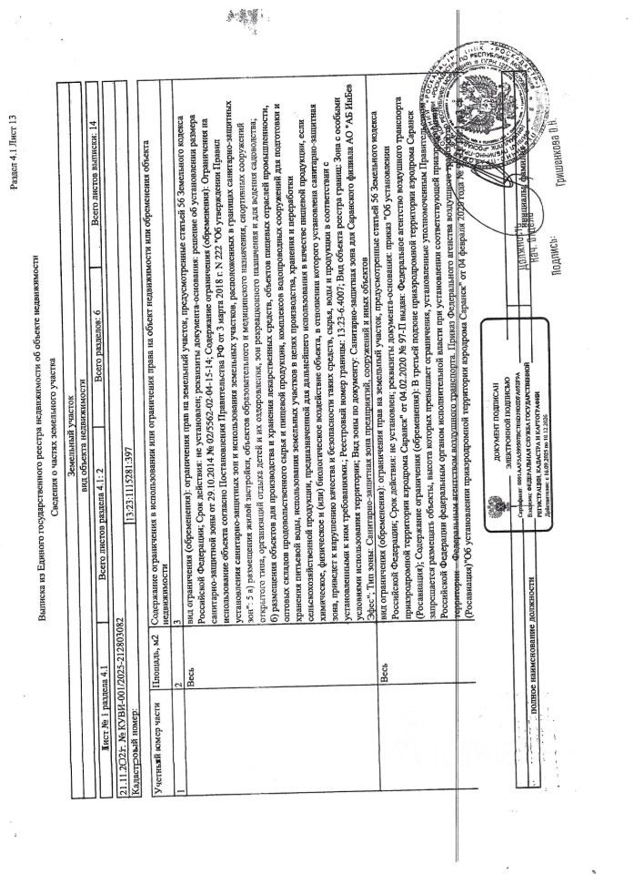 Земельный участок площадью 800+/-10 кв.м., кад. 13:23:1115281:397, категория земель: земли населённых пунктов, виды разрешённого использования: для ИЖС, находится в охранной зоне, принадлежит должнику Беляевой Е.П. Сведениями о фактическом состоянии объекта недвижимости организатор торгов не располагает. Техническая документация на объект недвижимости и его фотографии отсутствуют у организатора торгов.