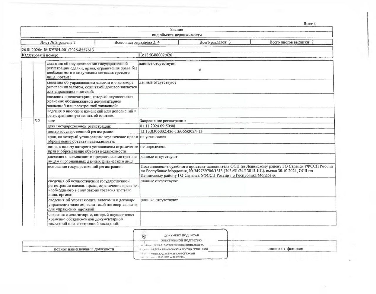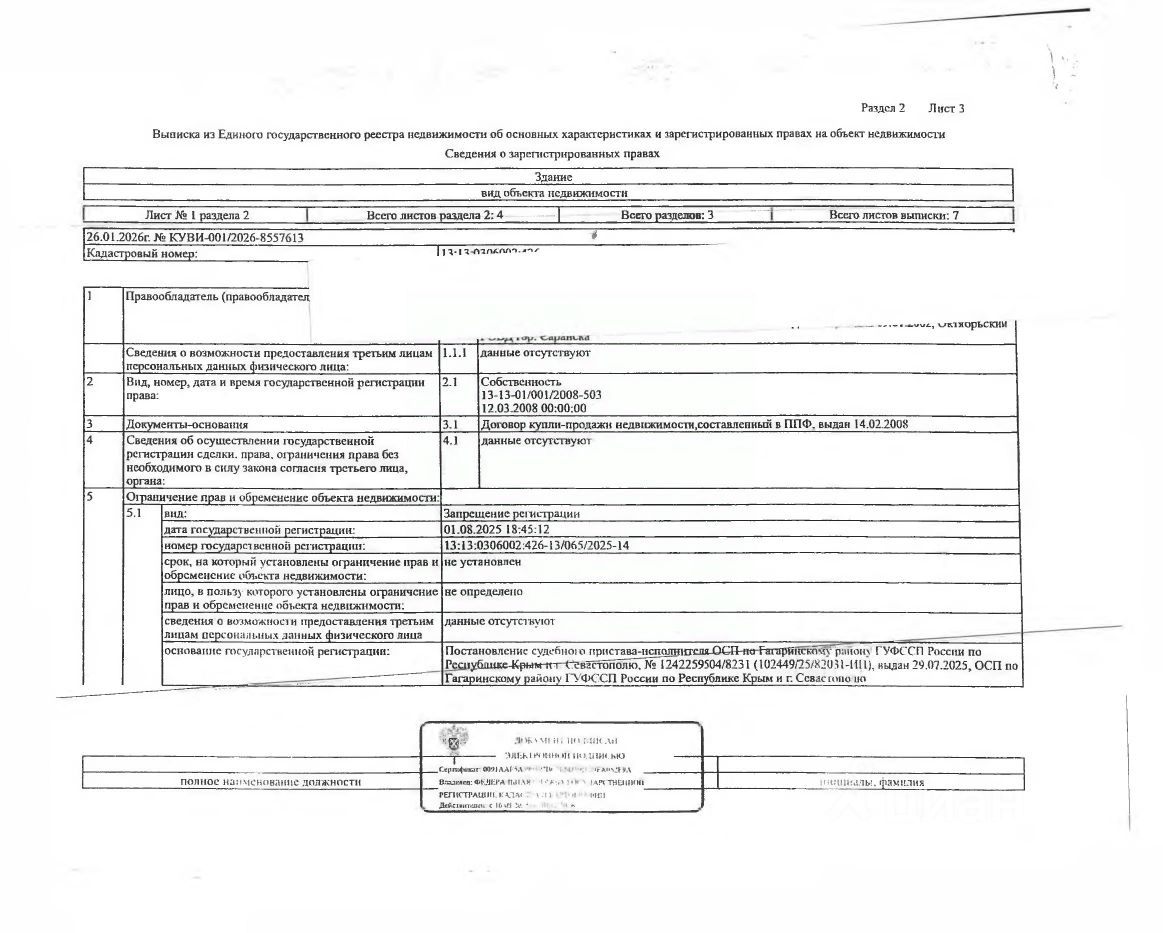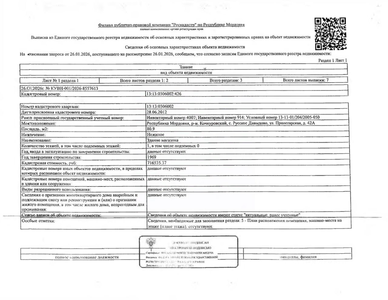 Нежилое помещение (здание магазина) общей площадью 80,9 кв.м., кад. 13:13:0306002:426, принадлежащее должнику Гусеву В.А. Сведения о правах на земельный участок, расположенный под зданием магазина, согласно ответа Росреестра отсутствуют. Сведениями о фактическом состоянии объекта недвижимости, о задолженности по коммунальным платежам организатор торгов не располагает. Техническая документация на объект недвижимости и его фотографии отсутствуют у организатора торгов.