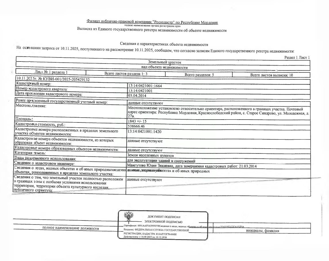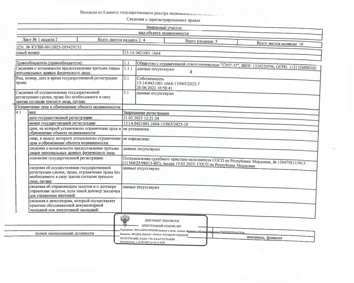 Земельный участок площадью 1843+/-15 кв.м., кад. 13:14:0421001:1664, категория земель: земли населённых пунктов, виды разрешённого использования: для эксплуатации зданий и сооружений, принадлежит должнику ООО "СМУ-55", ИНН 1326220596. В границах земельного участка зарегистрировано здание с кад. 13:14:0421001:1420, которое фактически отсутствует. Сведениями о фактическом состоянии объекта недвижимости организатор торгов не располагает. Техническая документация на объект недвижимости и его фотографии отсутствуют у организатора торгов.