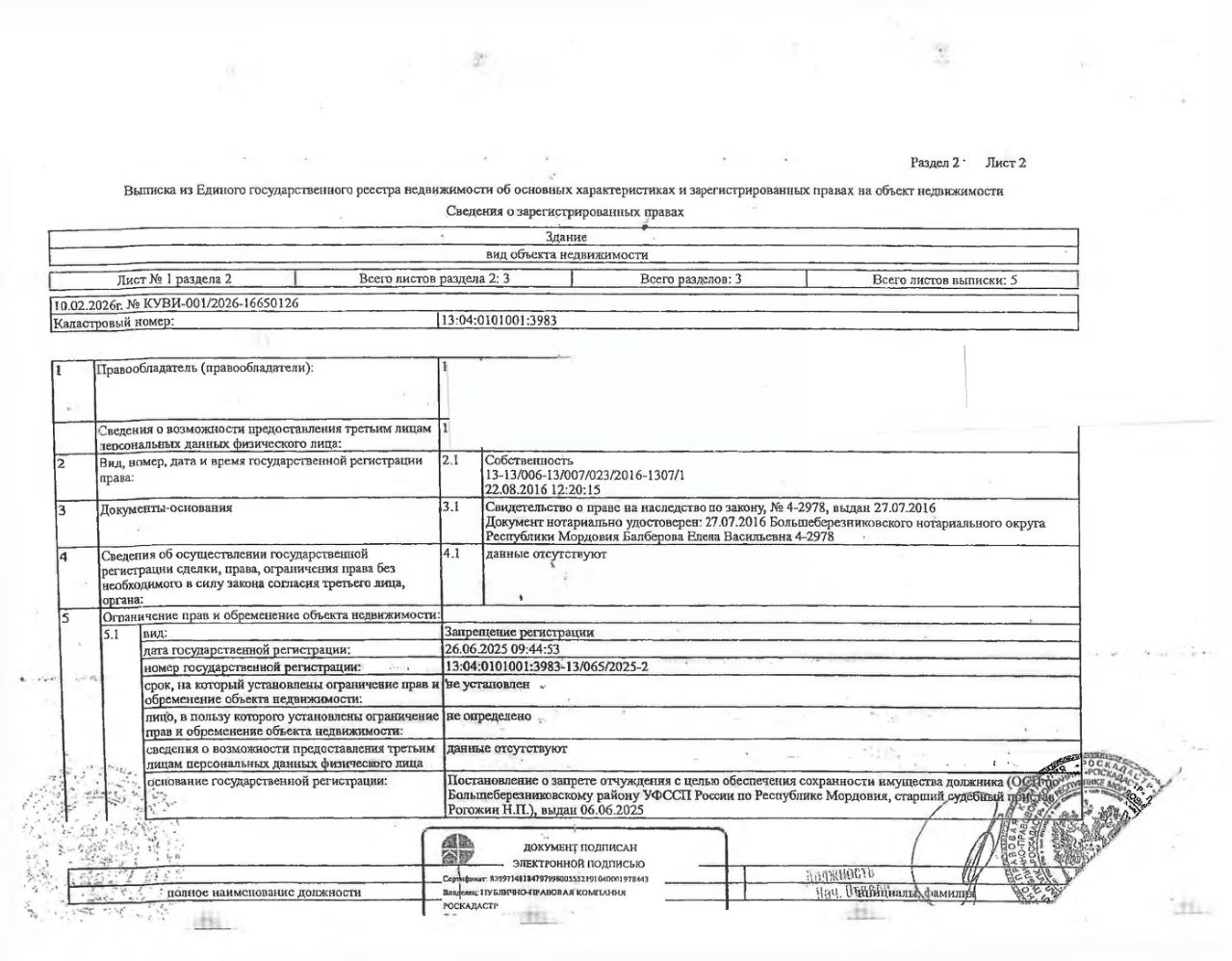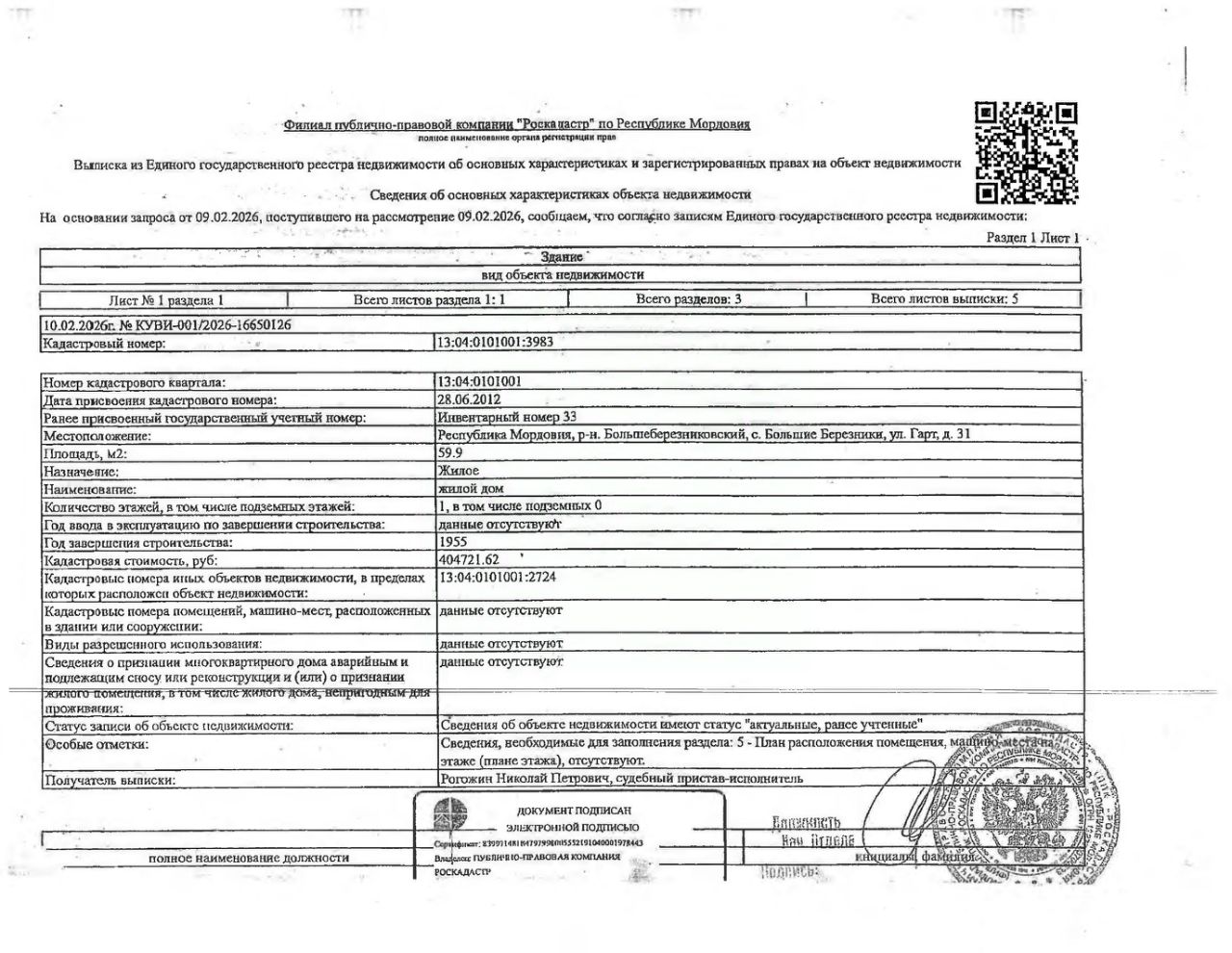 Жилой дом общей площадью 59,9 кв.м., кад. 13:04:0101001:3983, и земельный участок площадью 3500 кв.м., кад. 13:04:0101001:2724, категория земель: земли населённых пунктов, виды разрешённого использования: для ведения личного подсобного хозяйства. Объекты недвижимости зарегистрированы за Комаровой Н.А., в настоящее время признаны собственностью должника Комаровой И.В., как фактически принятое наследство. Необходимо проведение кадастровых работ по межеванию земельного участка, которые производятся за счёт покупателя. Сведениями о фактическом состоянии объектов недвижимости организатор торгов не располагает. Техническая документация на объект недвижимости и его фотографии отсутствуют у организатора торгов