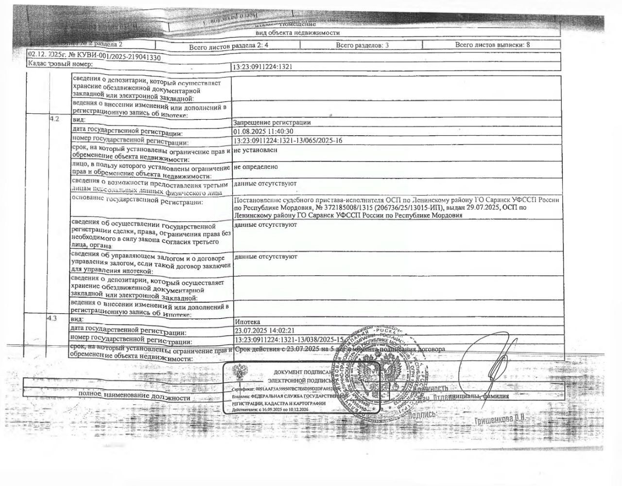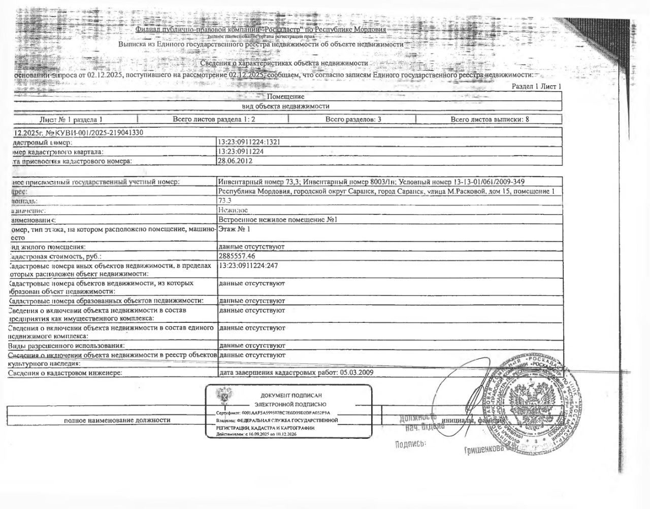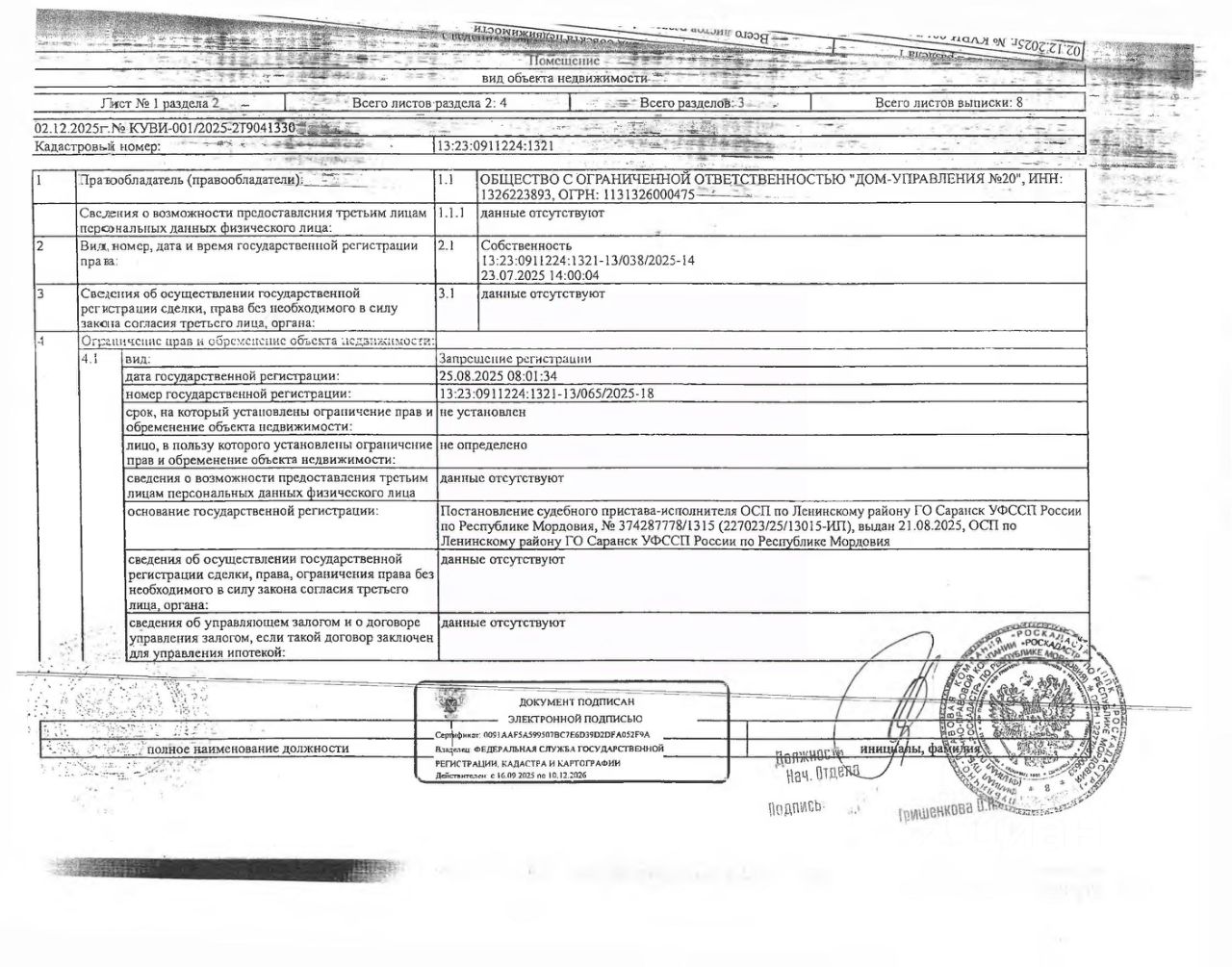 Нежилое помещение (встроенное) общей площадью 73,3 кв.м., кад. 13:23:0911224:1321, находящаяся в пределах объекта недвижимости с кад. 13:23:0911224:247, принадлежащее должнику ООО "Дом-управления 20", ИНН 1326223893. Сведениями о фактическом состоянии объекта недвижимости, о задолженности по коммунальным и иным платежам организатор торгов не располагает. Техническая документация на объект недвижимости и его фотографии отсутствуют у организатора торгов.