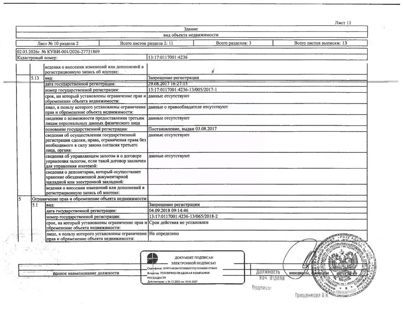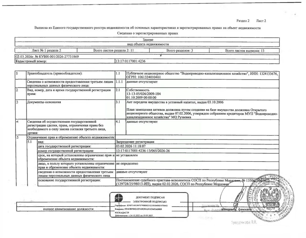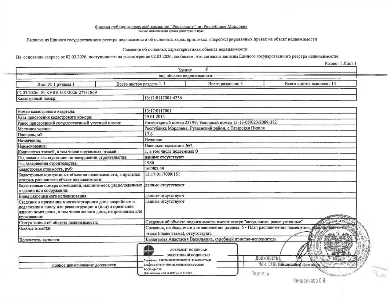 Нежилое здание (павильон-скважины 7) общей площадью 17,6 кв.м., кад. 13:17:0117001:4236, принадлежащее должнику ПАО "Водопроводно-канализационное хозяйство", ИНН 1324133676. Сведения о правах на земельный участок, расположенный под зданием, отсутствуют. По сведениям администрации г.п. Рузаевка, земельный участок на кадастровом учёте не стоит. Сведениями о фактическом состоянии здания и о задолженности по обязательным платежам организатор торгов не располагает. Техническая документация на объект недвижимости и его фотографии отсутствуют у организатора торгов.