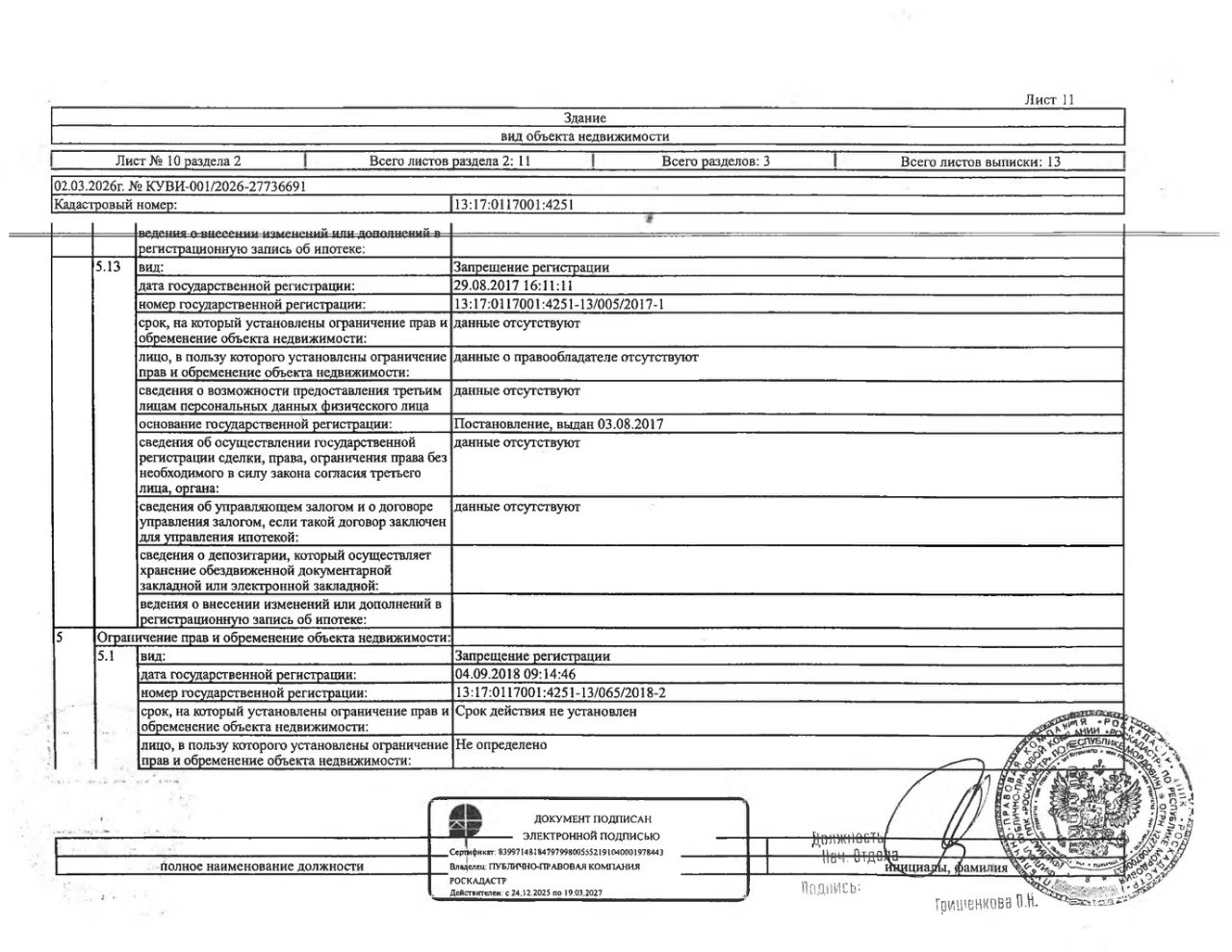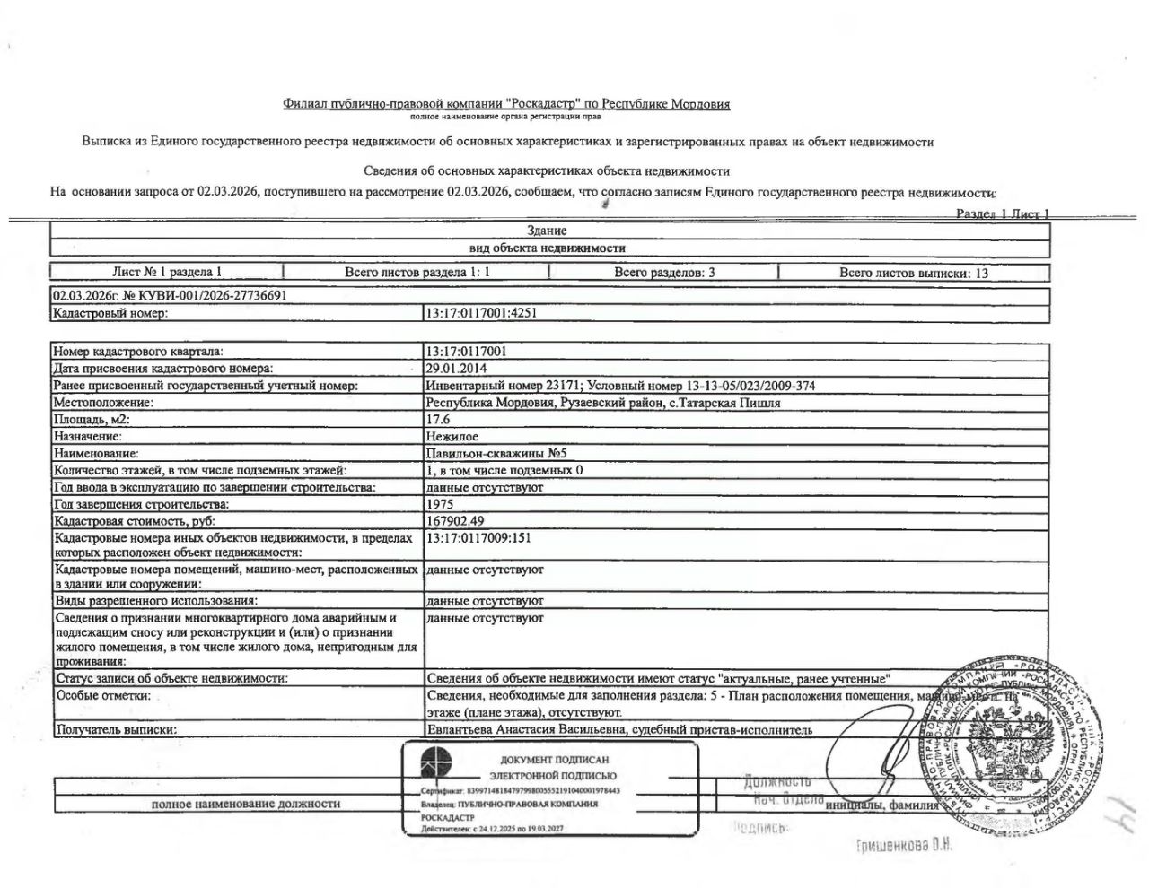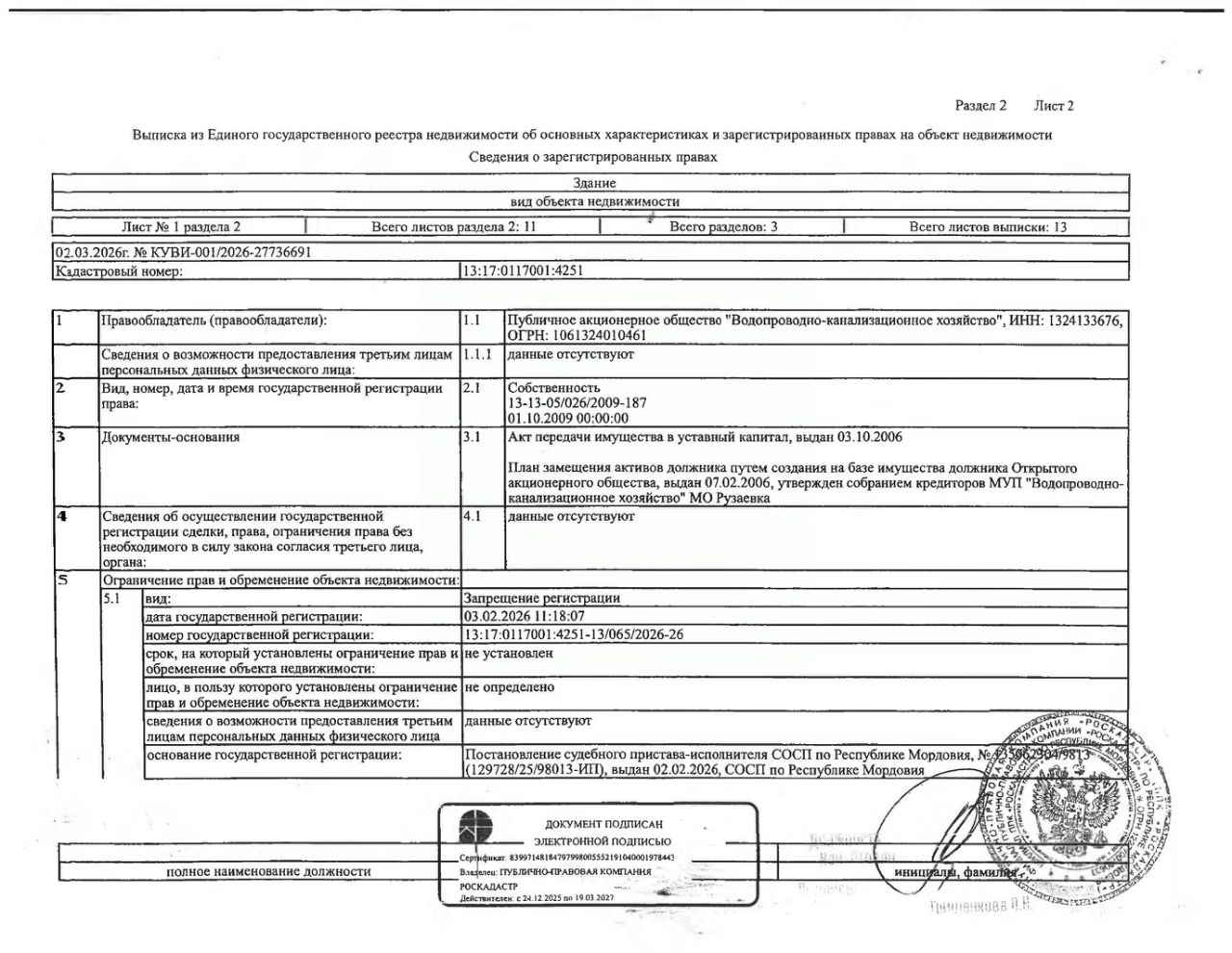 Нежилое здание (павильон-скважины 5) общей площадью 17,6 кв.м., кад. 13:17:0117001:4251, принадлежащее должнику ПАО "Водопроводно-канализационное хозяйство", ИНН 1324133676. Сведения о правах на земельный участок, расположенный под зданием, отсутствуют. По сведениям администрации г.п. Рузаевка, земельный участок на кадастровом учёте не стоит. Сведениями о фактическом состоянии здания и о задолженности по обязательным платежам организатор торгов не располагает. Техническая документация на объект недвижимости и его фотографии отсутствуют у организатора торгов.