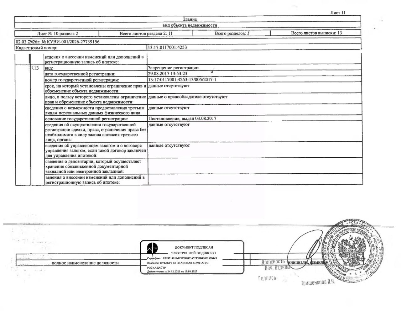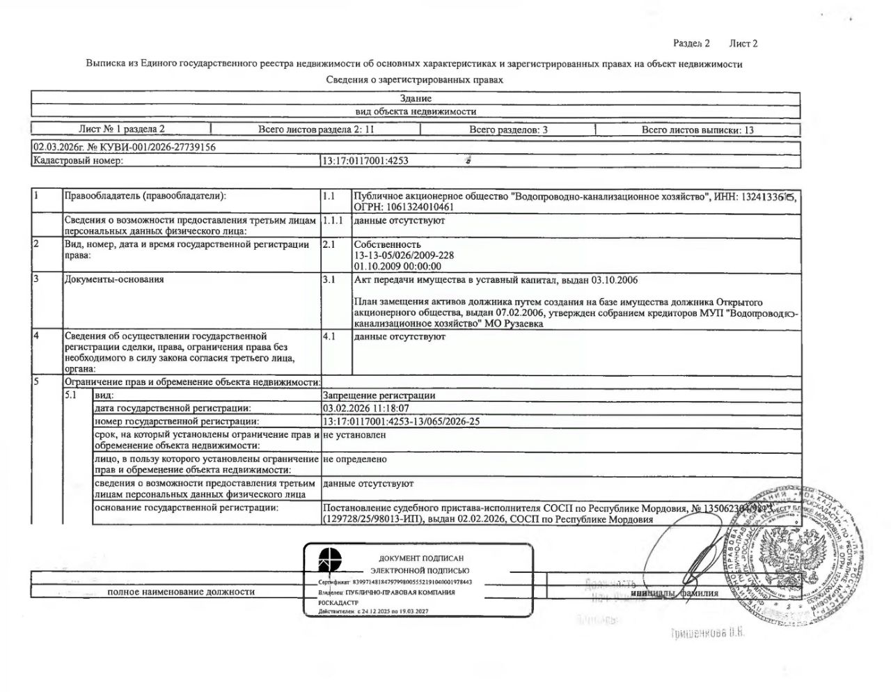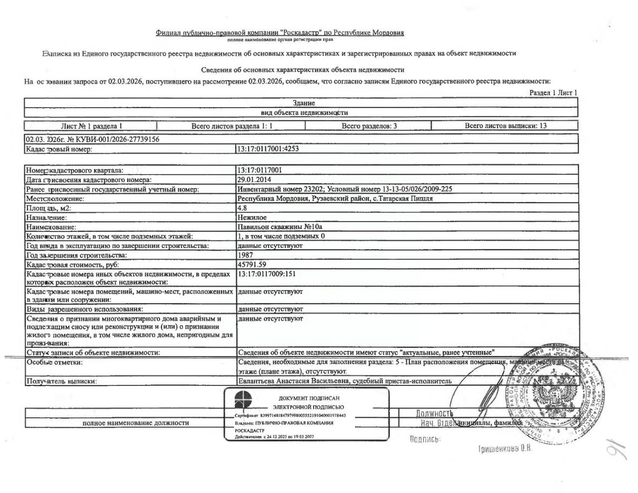 Нежилое здание (павильон-скважины 10-а) общей площадью 4,8 кв.м., кад. 13:17:0117001:4253, принадлежащее должнику ПАО "Водопроводно-канализационное хозяйство", ИНН 1324133676. Сведения о правах на земельный участок, расположенный под зданием, отсутствуют. По сведениям администрации г.п. Рузаевка, земельный участок на кадастровом учёте не стоит. Сведениями о фактическом состоянии здания и о задолженности по обязательным платежам организатор торгов не располагает. Техническая документация на объект недвижимости и его фотографии отсутствуют у организатора торгов.