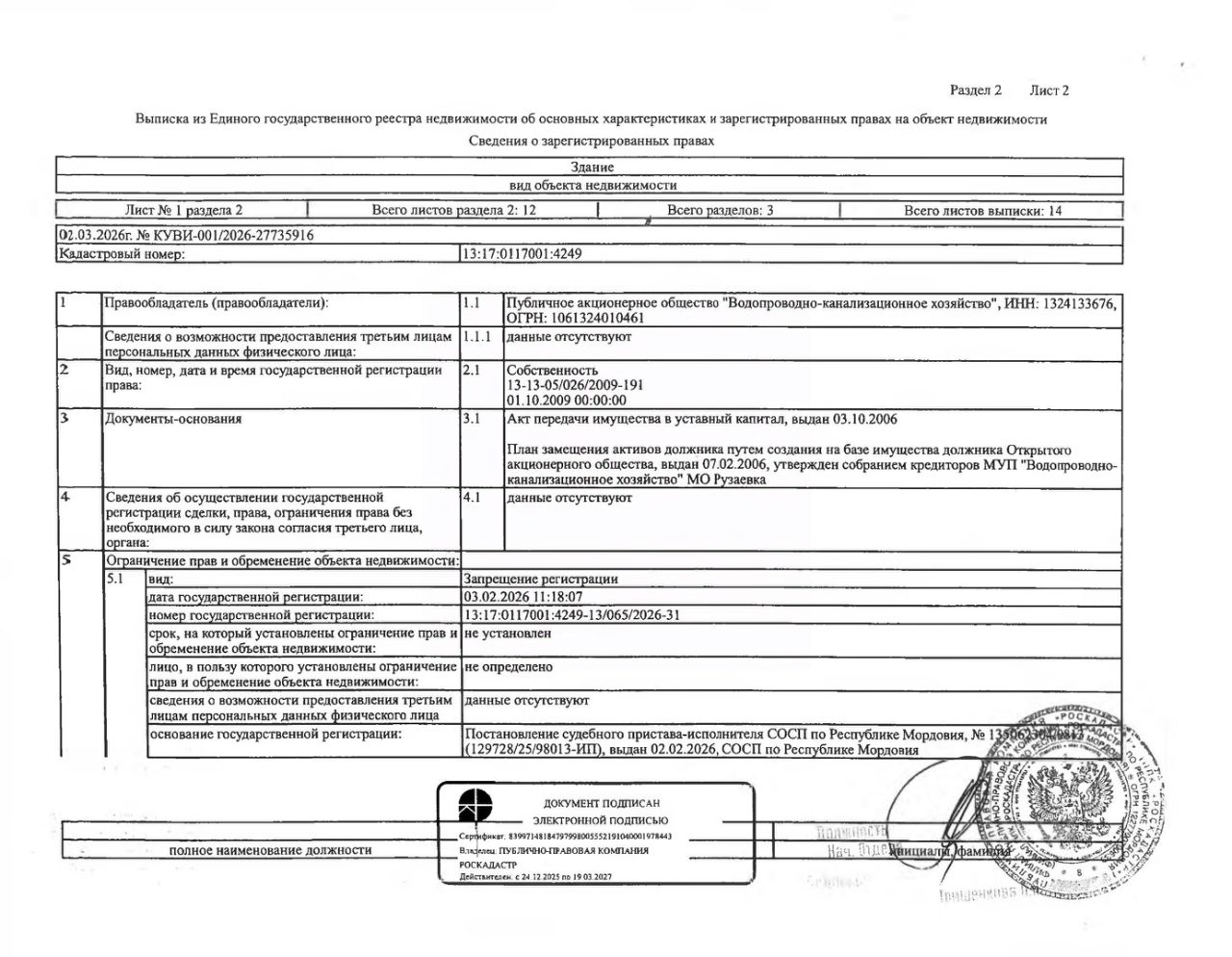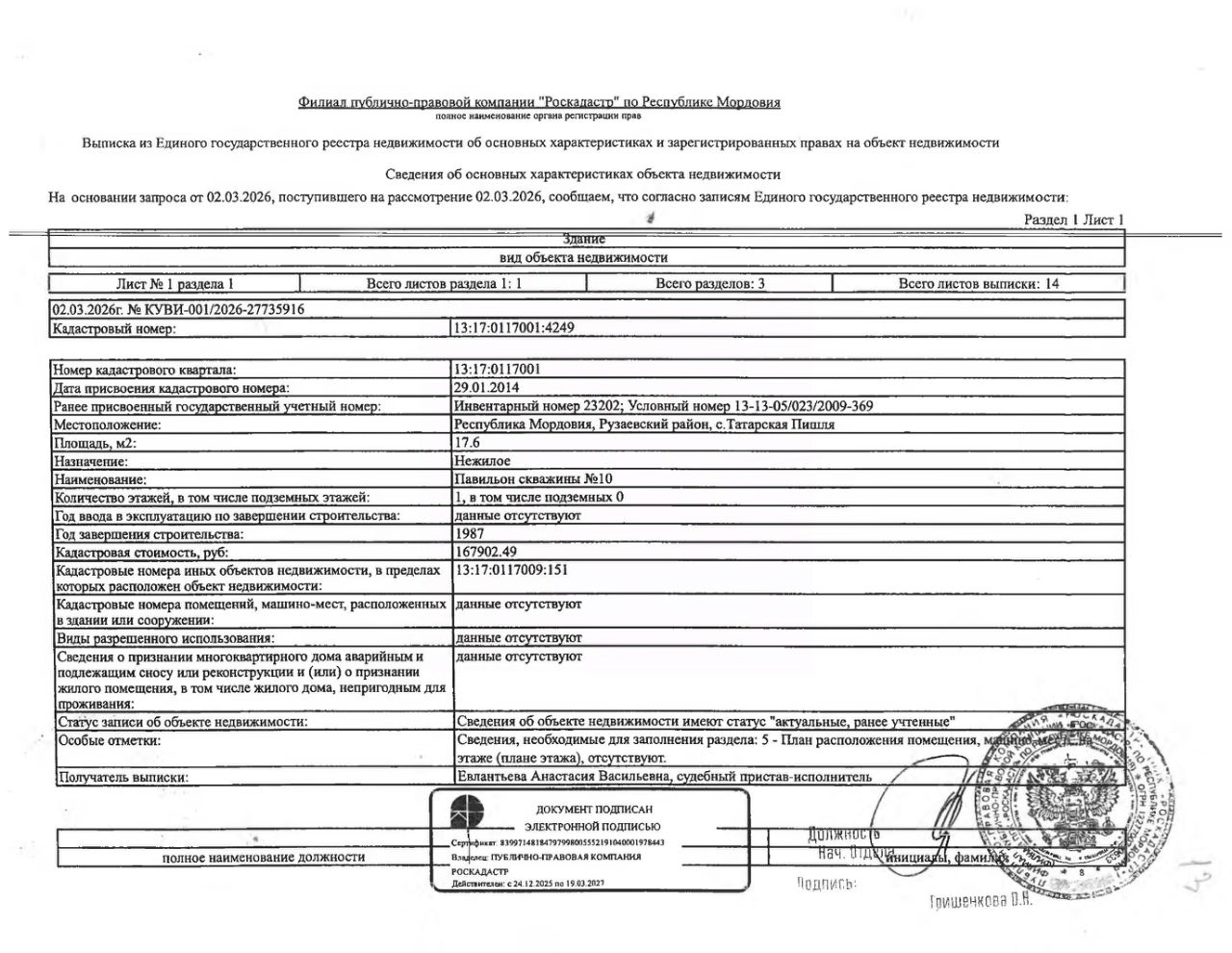 Нежилое здание (павильон скважины 10) площадью 17,6 кв.м., кад. 13:17:0107001:4249, принадлежащее должнику ПАО "Водопроводно-канализационное хозяйство", ИНН 1324133676. Сведения о правах на земельный участок, расположенный под зданием, отсутствуют. По сведениям администрации г.п. Рузаевка, земельный участок на кадастровом учёте не стоит. Сведениями о фактическом состоянии здания и о задолженности по обязательным платежам организатор торгов не располагает. Техническая документация на объект недвижимости и его фотографии отсутствуют у организатора торгов.