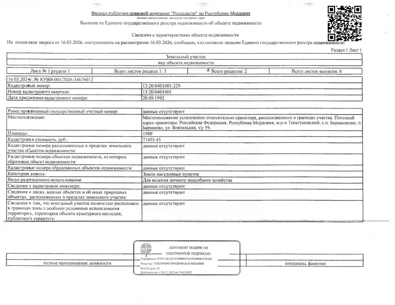 Земельный участок площадью 1500 кв.м., кад. 13:20:0401001:229,, с расположенными на нём жилым домом общей площадью 40 кв.м., и надворными постройками: кухня, баня, сарай. Земельный участок зарегистрирован на гр. Лапину А.С. Жилой дом, кухня, баня, сарай не зарегистрированы в соответствии с законодательством. Объекты недвижимости являются выморочным имуществом в силу перехода в порядке наследования по закону в собственность должника администрация Барашевского с/п Т Теньгушевского м/р Респ. Мордовия, что подтверждается решением Темниковского районного суда РМ от 29.09.2025г. По месту нахождения объектов недвижимости зарегистрирован один гражданин. Проведение кадастровых работ осуществляется за счёт покупателя имущества. Сведениями о размере задолженности по коммунальным платежам организатор торгов не располагает. Техническая документация и фотографии объекта недвижимости организатору торгов не предоставлялись