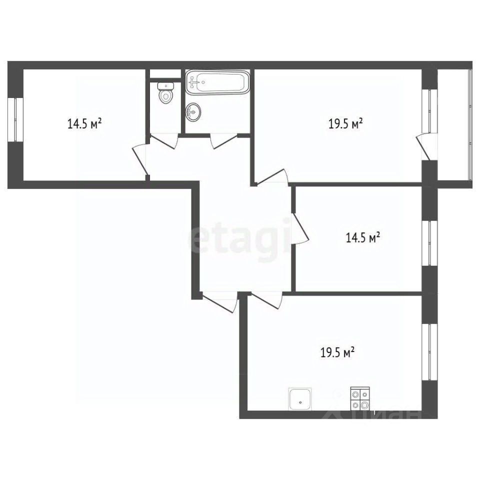 Прекрасная планировка: кухня-гостиная 19,5 кв. м. и 3 комнаты (14, 14 и 19 кв. м.), санузел раздельный, большая прихожая.