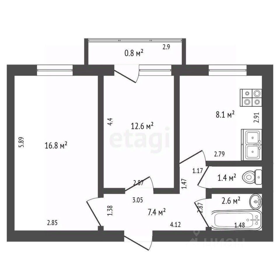 Общая площадь 48,9 кв. м, кухня 8,1 кв. м.