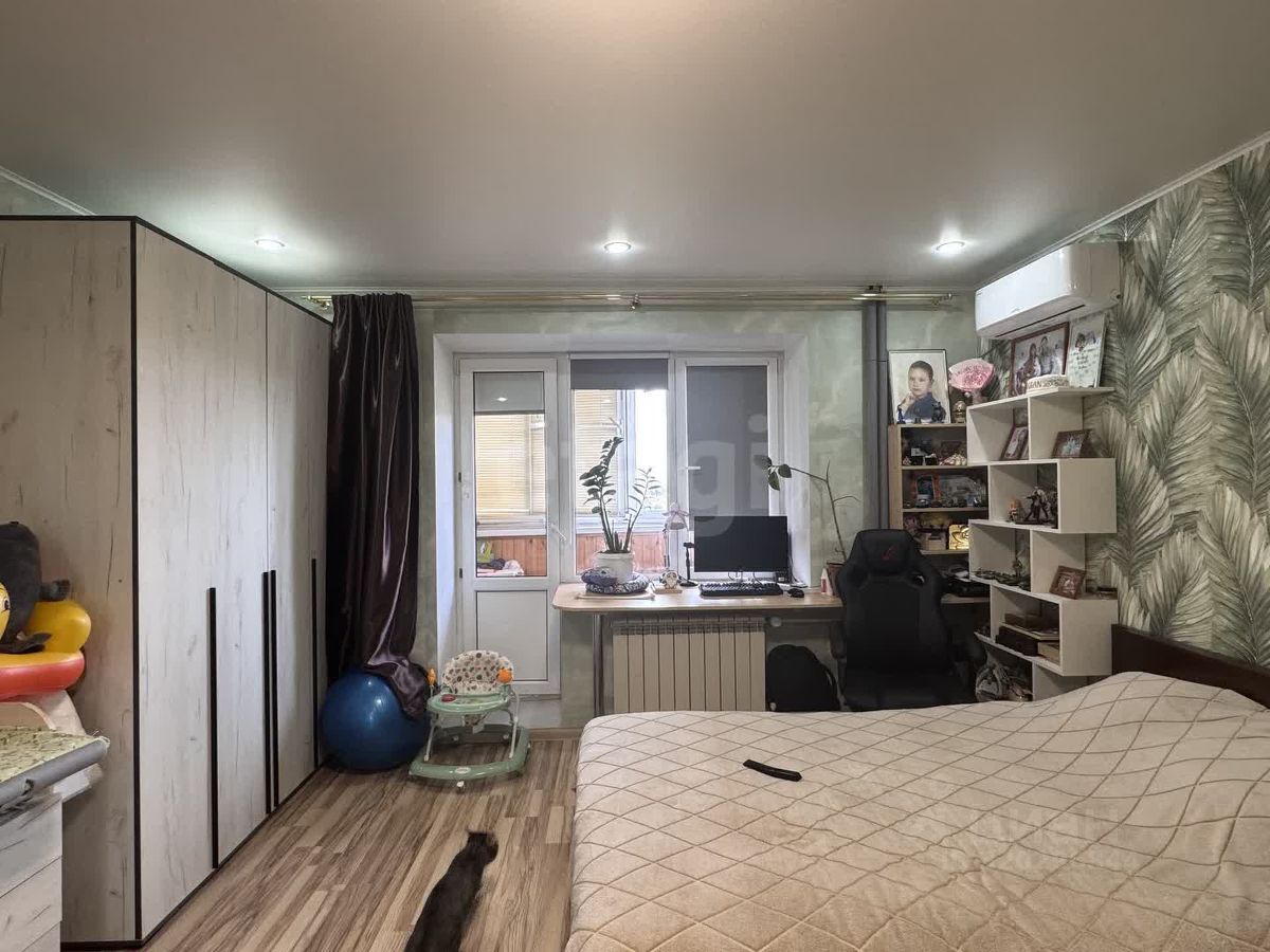 Большая жилая комната — 21,6 м.кв., правильной формы, с выходом на застекленный пластиковыми окнами балкон и отделанный вагонкой.