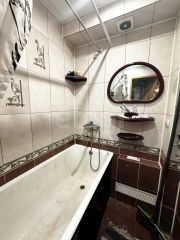 Планировка типа "распашонка" с окнами на разные стороны гарантирует хорошую естественную освещенность в течение дня. Две изолированные комнаты и одна проходная позволяют гибко зонировать пространство — под спальни, кабинет или детскую. Санузел раздельный, полностью облицован кафелем.