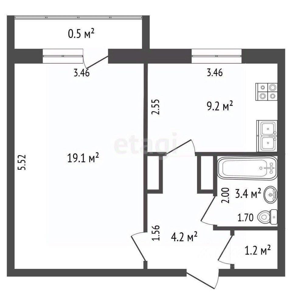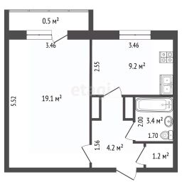 - общая площадь 37.10 кв. м; жилая — 19.1 кв. м; кухня — 9.2 кв. м;