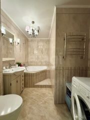 В квартире со вкусом сделан прекрасный ремонт из премиальных материалов. Общая площадь 55,1 кв. м., просторная кухня-гостиная. Окна выходят на парк им. Пушкина. Санузел совмещенный и очень просторный. В санузле и кухне-гостиной установлены теплые полы, что создает особый комфорт. На лоджии организована приятная зона отдыха, которая отгорожена от комнаты панорамным французским окном. В одной из спален размещена просторная гардеробная.
