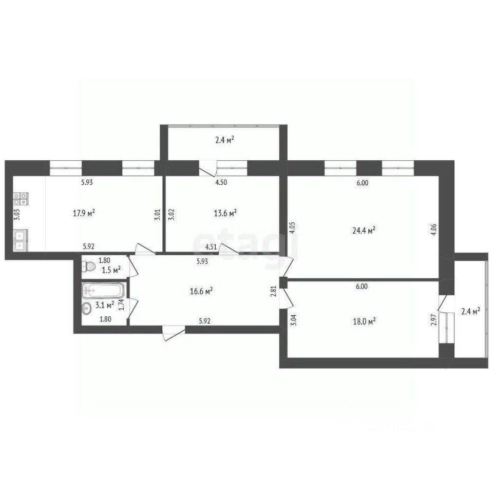 Площадь кухни 17,9 кв. м, зал 24,4, спальни — 18 и 13,6 кв. м. Каждая спальня имеет выход на лоджию.