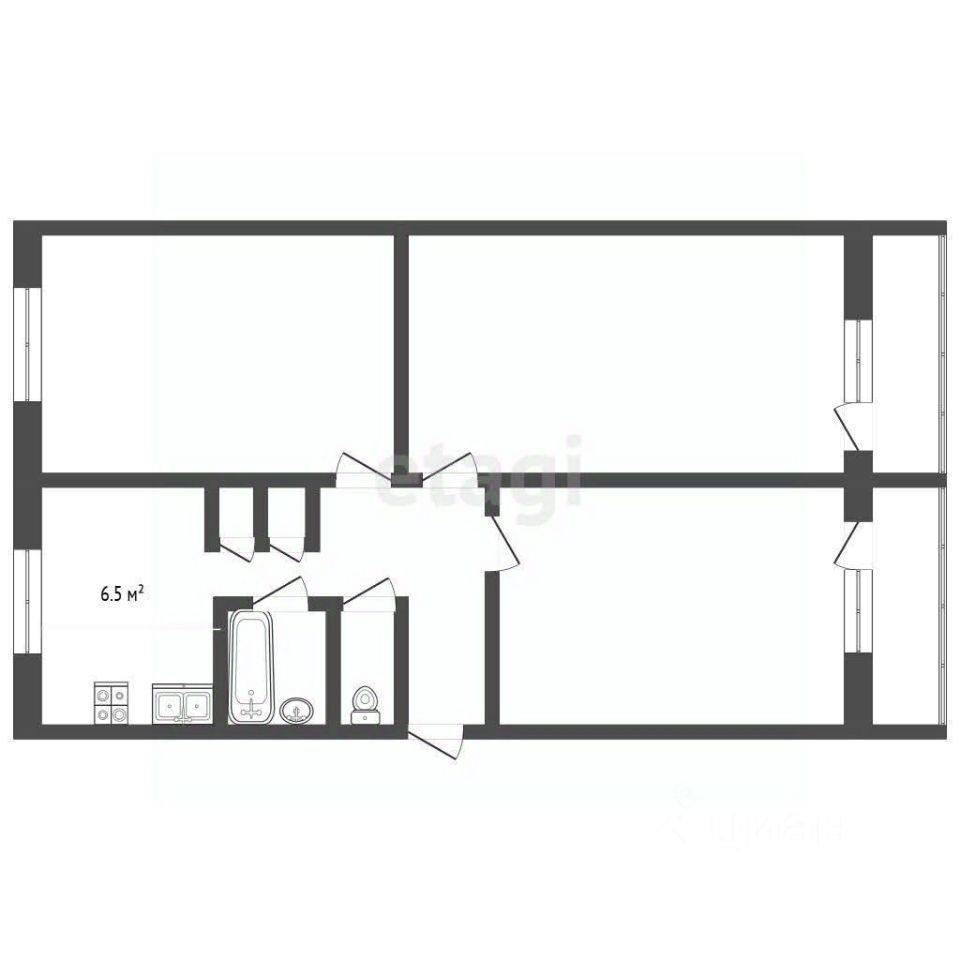 Две застекленные лоджии (1.5 кв. м и 1.4 кв. м) добавляют полезную площадь и могут выполнять различные функции — от зоны для хранения до места для отдыха. Раздельный санузел облицован кафельной плиткой, кухня стандартных размеров функционально организована.