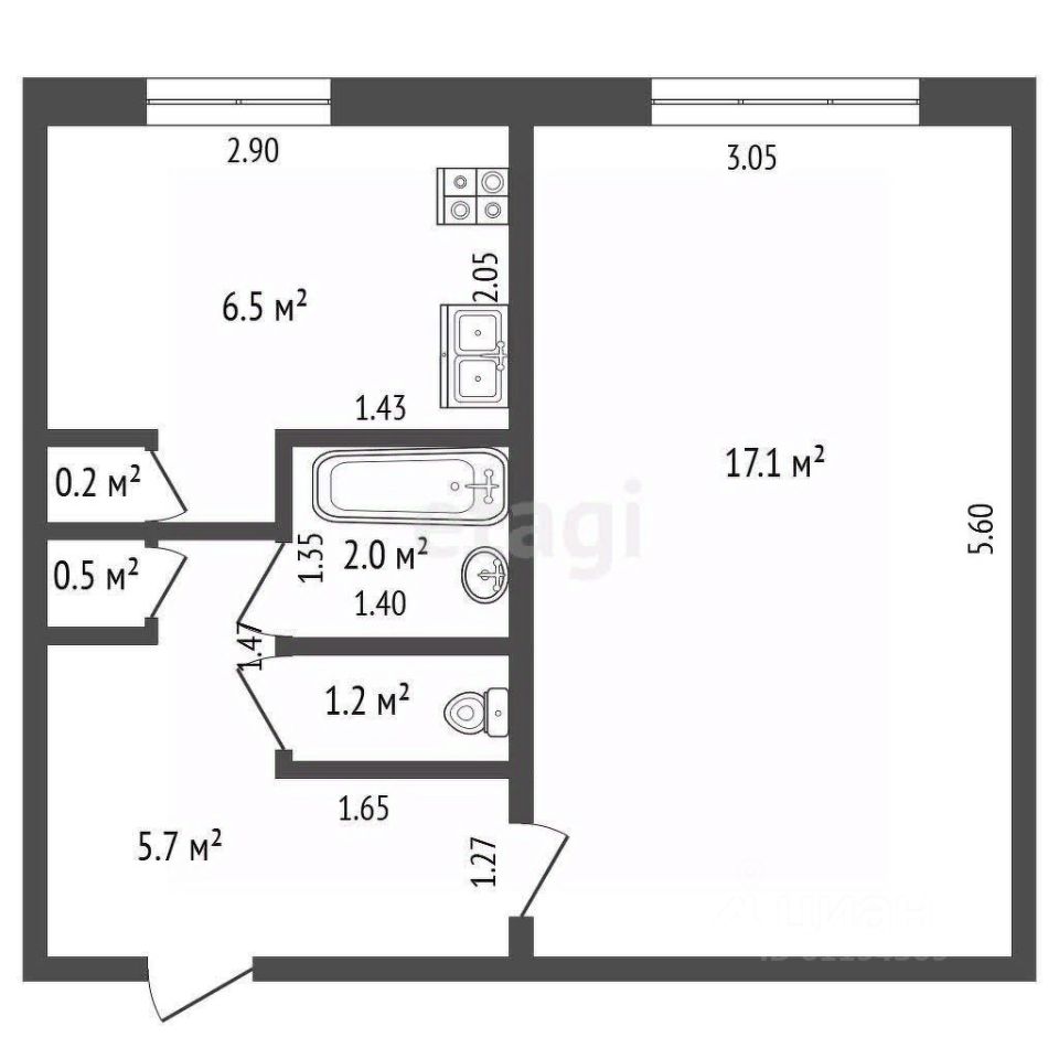 - кухня 6.5 кв., жилая - 17.1 кв.м;