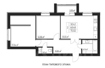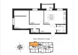 -Продаётся 2-комнатная квартира общей площадью 70,02 м2, на 2 этаже 8 этажного кирпичного дома.