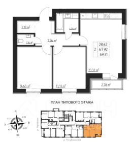 -Продаётся 2-комнатная квартира общей площадью 69,31 м2, на 2 этаже 8 этажного кирпичного дома.