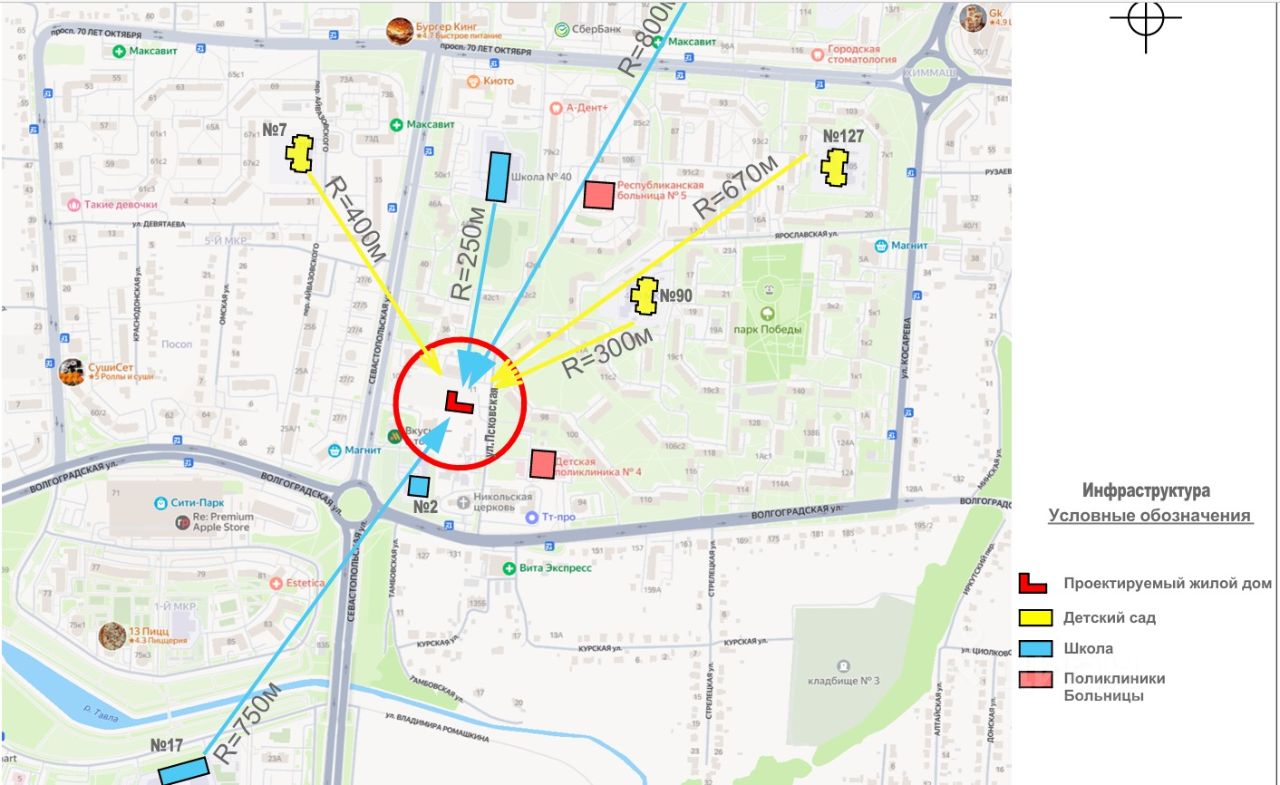 В шаговой доступности находятся детские сады 7, 90, 127, школа 2, 40, магазины, аптеки, ТЦ Сити Парк, детская поликлиника 4, поликлиника для взрослых 3, 5, остановки общественного транспорта. Удобное расположение, безопасный двор и зеленые зоны делают покупку квартиры идеальным выбором для тех, кто желает жить в наполненной смыслом среде.