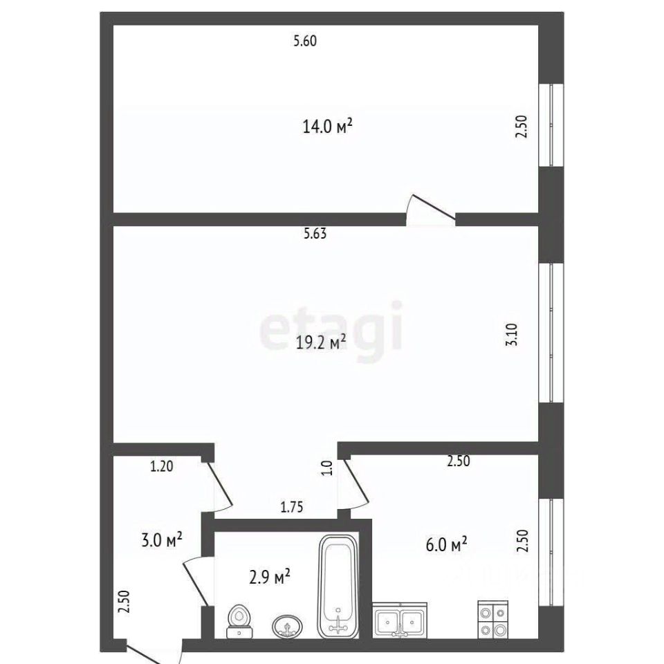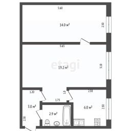 Общая площадь — 45,1 кв. м, кухня 6 кв. м, комнаты 14 и 19,2 кв. м.