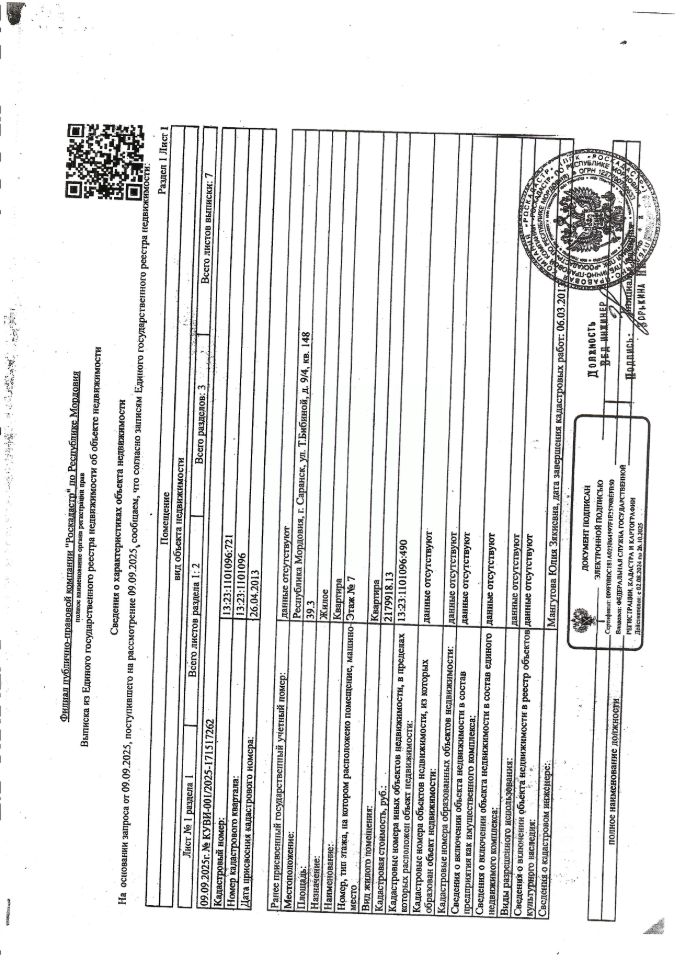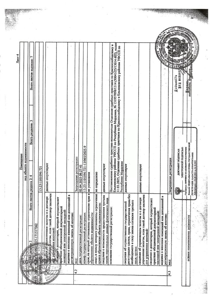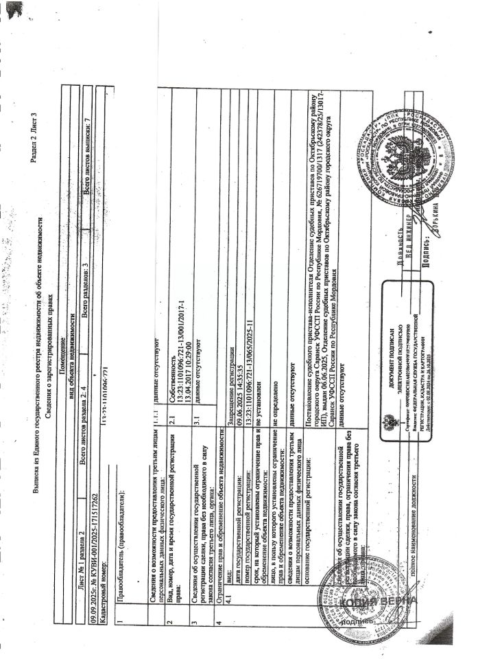 Жилое помещение (квартира) общей площадью 39,3 кв.м., кад. 13:23:1101096:721, этаж 7, находящееся в пределах объекта недвижимости с кад. 13:23:1101096:490, принадлежащее должнику Маркину О.М. Сведениями о фактическом состоянии объекта недвижимости, о задолженности по коммунальным платежам и взносам на капитальный ремонт организатор торгов не располагает. Техническая документация на объект недвижимости и его фотографии отсутствуют у организатора торгов.