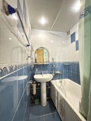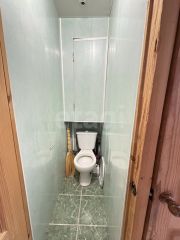 Раздельный санузел оборудован удобной ванной комнатой, облицованной плиткой, и туалетом, отделанным пластиковыми панелями.