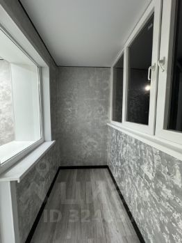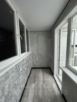 Просторная лоджия с выходом из кухни отделана декоративной штукатуркой, на полу также ламинат и натяжные потолки